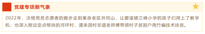 2022年,伟德国际1949党员志愿者的脚步走到革命老区井冈山,让碧溪镇三峰小学的孩子们用上了教学机;也深入附近定点帮扶的河坪村,请来洞村非遗老师傅带领村子贫困户用竹编技术扶贫。