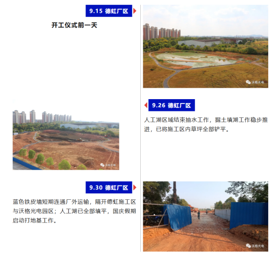 伟德国际1949Mini/Micro LED 玻璃基板生产项目于2022年9月16日正式开工建设,施工现场各项工作正如火如荼进行中——园区划分隔离,人工湖改造填平,原用地草坪清理,填挖管道,建设地基……
