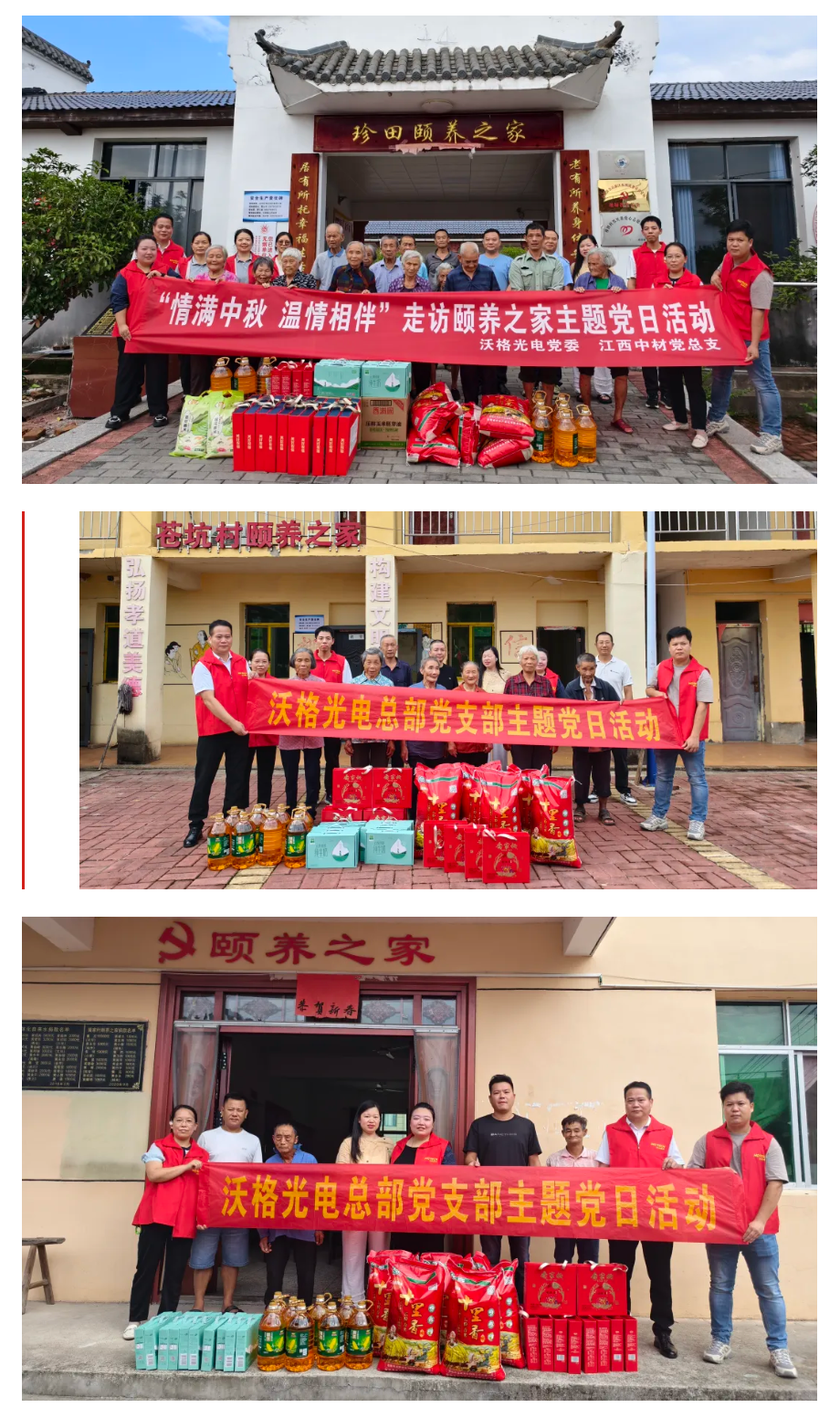 在国庆、中秋“双节”将至的温馨时刻,9月25日,伟德国际1949总部党支a部书记刘璐带领由支部委员组成的慰问队,在新余高新区党群工作部袁娣的陪同下,怀揣真情暖意,先后前往珍田村、苍坑村、黄家村三家颐养之家,将企业的节日问候与祝福送到老人身边。慰问队为老人们送去月饼、牛奶、食用油、大米等贴心的节日礼物,还与老人们亲切交流,细心询问他们的生活起居与卫生保健情况,用实际行动让老人们在佳节前夕感受到浓浓的温暖与关怀。