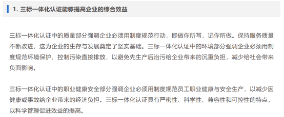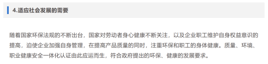 随着国际市场一体化进程的加快,中国企业的各项管理标准也愈趋与国际标准接轨,无论从市场竞争的角度,针对贸易存在的客观条件,还是不断提高企业管理水平的需要,实施质量、环境与职业健康安全管理体系都将是企业发展的一个趋势和方向。